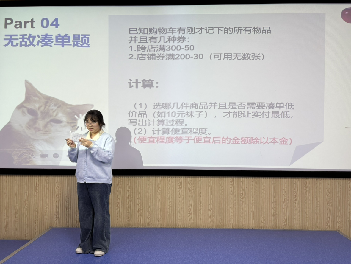 本次活动以双十一满减为切入点,用互动答题打破数学的距离感。15分钟热身环节里,真实满减场景将化作趣味考题,分组合作的形式让思维碰撞火花;专业讲解环节中,分段函数、不等式优化等知识将揭开凑单省钱的核心密码。同学们既能练就精准计算的“省钱本领”,又能重拾对数学的探索热情,更能树立理性消费的生活理念。