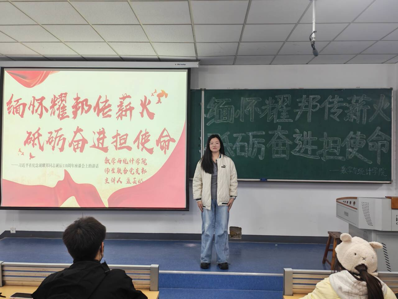为深入学习贯彻胡耀邦的崇高精神风范和优良作风,进一步提升青年的政治素养和理论水平,数学与统计学院于2025年11月26日晚5点50分在理13组织党员、预备党员、积极分子、团总支、学生会、自律委员会学生干部学习研究《习近平在纪念胡耀邦同志诞辰110周年座谈会上的讲话》部分内容。此次党课活动以“缅怀耀邦传薪火,砥砺奋进担使命”为主题,主讲人为积极分子孟芸妃同志。