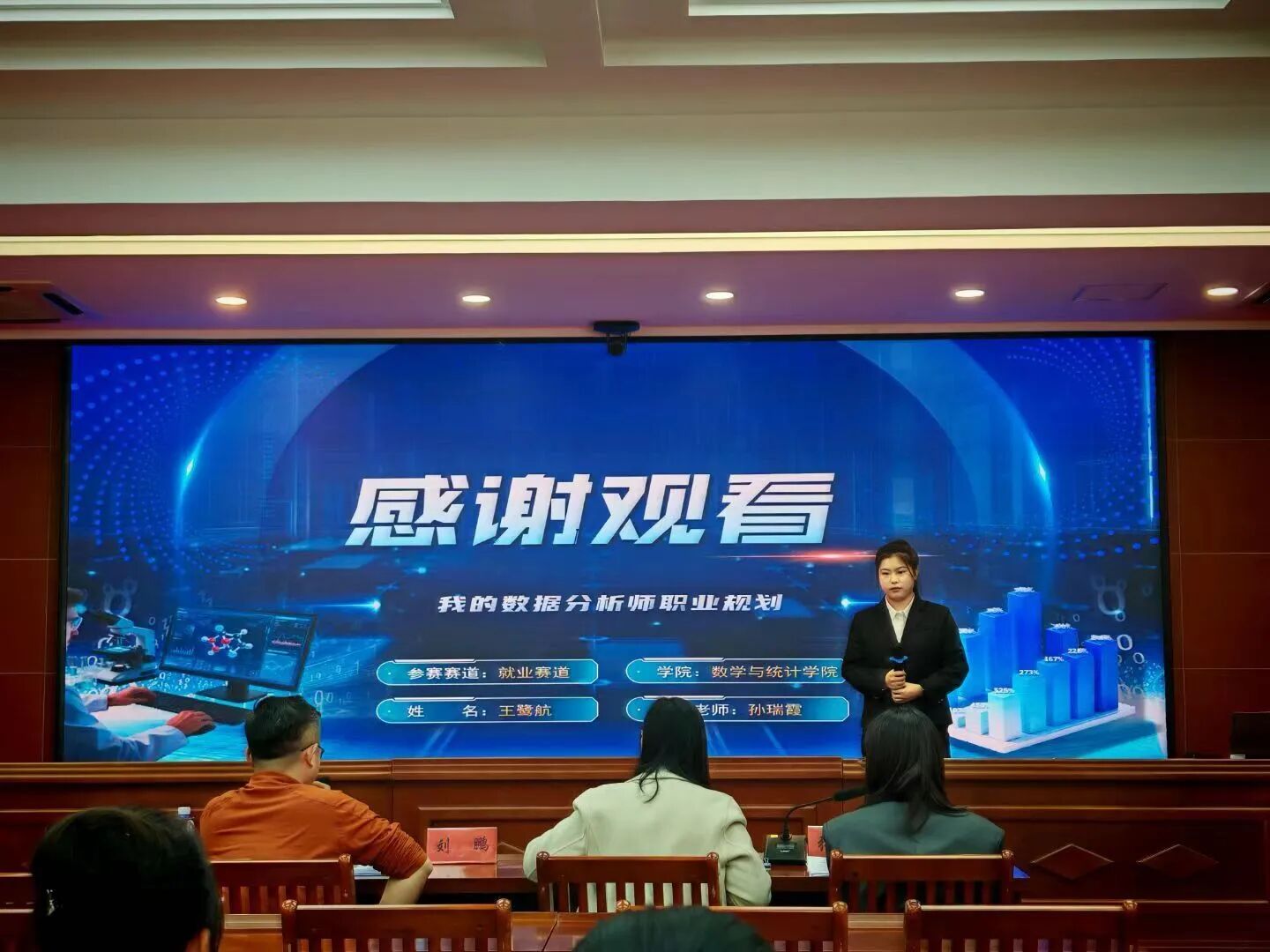 我院学生王鹭航凭借院赛的优异成绩进入就业赛道校赛。校赛现场,她围绕职业目标定位,发展路径规划,实施策略落地等内容,全面展现对数据行业的深刻认知与职业潜力。答辩环节,面对评委提出的问题,她结合自身的课程实践与实习经历,提出切实可行的解决方案,展现了从容自信、积极向上的青年风采,在大学生职业规划大赛校赛中荣获一等奖。