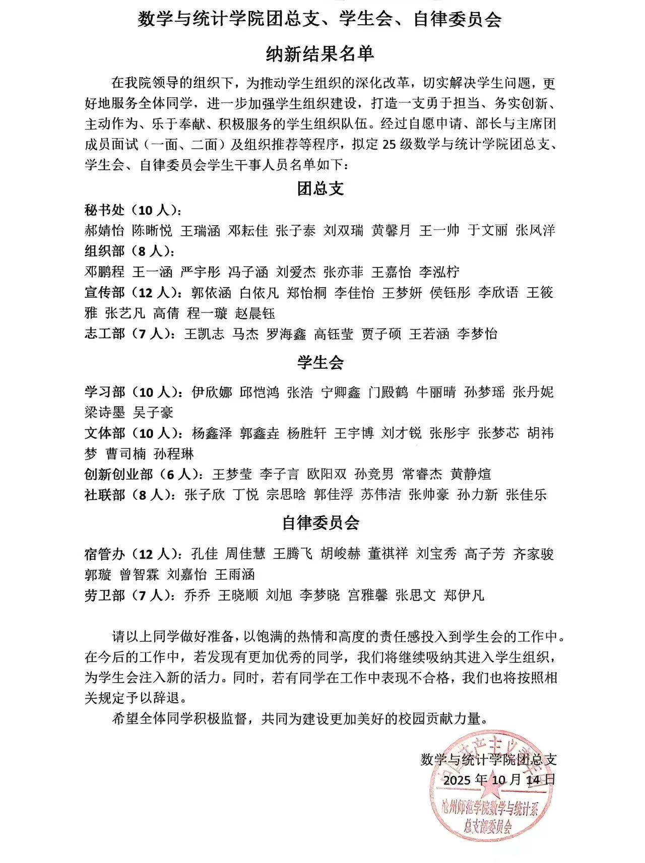 金风送爽启新程,青春聚力谱华章。在这满载希望与活力的季节,数学与统计学院团总支、学生会、自律委员会迎来了一群怀揣热忱与理想的新成员。他们带着服务同学的赤诚、建设集体的期待,将以数学学科的严谨思维诠释责任,用蓬勃的青春朝气为我院学生工作注入新的动力。此刻,让我们共同聚焦这份鲜活的青春答卷,见证他们的风采绽放。