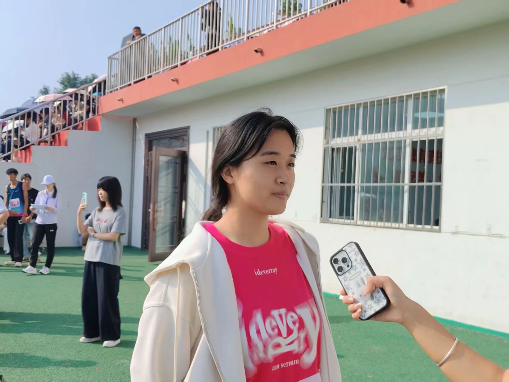 答:氛围特别好!整个操场活力满满,跳高垫旁、沙坑边都围着为选手呐喊的同学。这种热烈又暖心的氛围,让我赛前的紧张消了大半,起跳、助跑时更敢全力发挥,感觉每一次尝试都不是孤军奋战,身后的加油声就是最坚实的后盾。